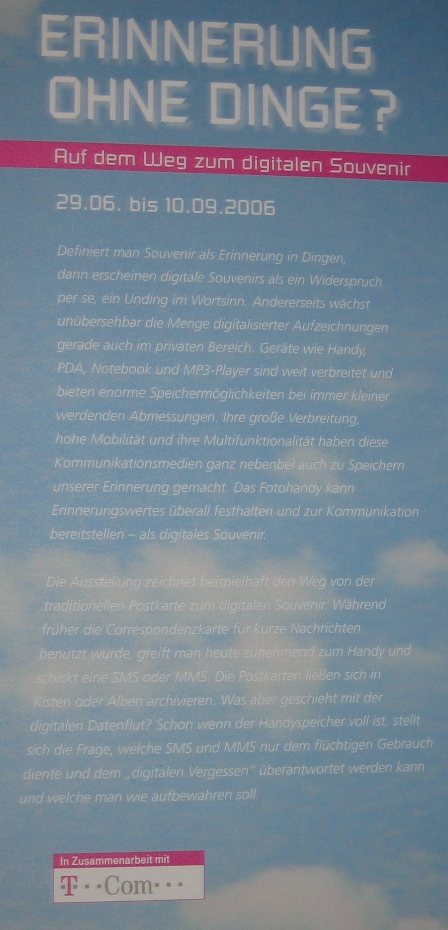 Bei einem Tagesbesuch in Frankfurt war ich mit meiner freundin mit "Museum für Kommunikation". Dort war eine Austtelung von T-Com zum Thema "Erinnerung ohne Dinge - Auf dem Weg zum digitalen Souvenir".