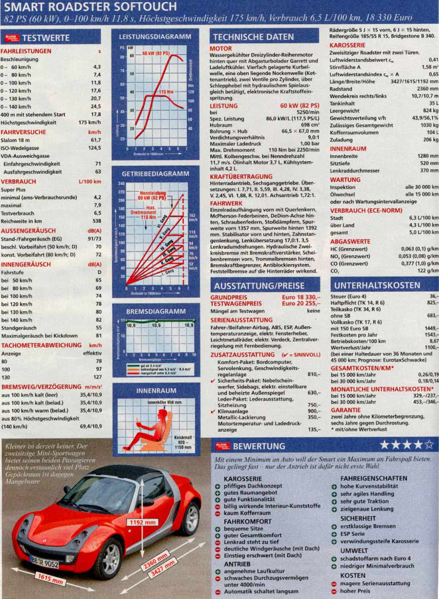 • also: den artikel hab ich mir nicht durchgelesen, weil ich schon bescheid weiß, dass handling, straßenlage & dynamik usw. top sind beim smart. verbrauch ist auch nicht schlecht, aber das war auch schon von vornherein klar -> kleiner motor, leichtes auto. das gewicht stellt einen hohen faktor für den fahrspass dar.