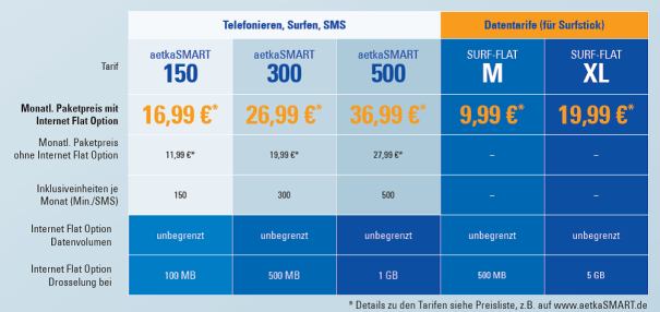 - Aetka Smart 300 = 300 Min./SMS in alle Netze + Unbegrenzte Internet Flat = 26,99 € Monat ( 19,99 € ohne Internetflat ) Drosselung der Internet Flat ab 500 MB
