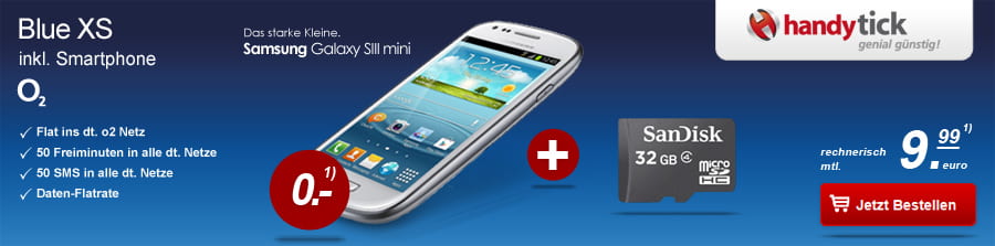 O2 Blue XS My Handy 50 Min./SMS + Internet + O2 Flat| nur 9,99€ mtl.* + S3 Mini