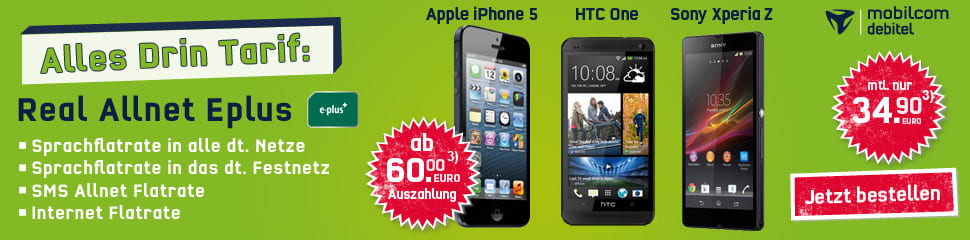 auch im Eplus Netz von Mobilcom-Debitel bieten wir euch eine "real Allnet Flat" zum monatlichen Paketpreis von 34,90€ an inklusive Top Smartphones zu folgenden Konditionen:
