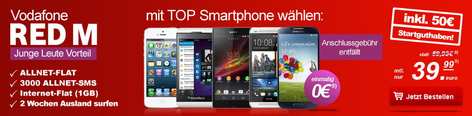 Vodafone Red M Junge Leute|Allnet Flat inkl. 1GB Daten nur 39,99€ mtl.|S4/iP5/Z zu 0€