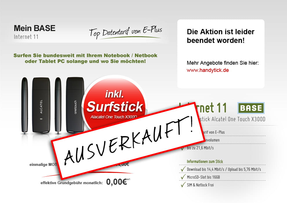 Ihr erhaltet zu diesem Tarif einen Alcatel One Touch X300D Surfstick inklusive 264€ einmalige Auszahlung!