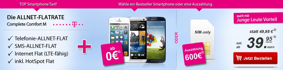 Telekom Complete Comfort M Allnet Flatrate inkl. 750MB LTE| iP5/S4/One etc. zu 0€!*