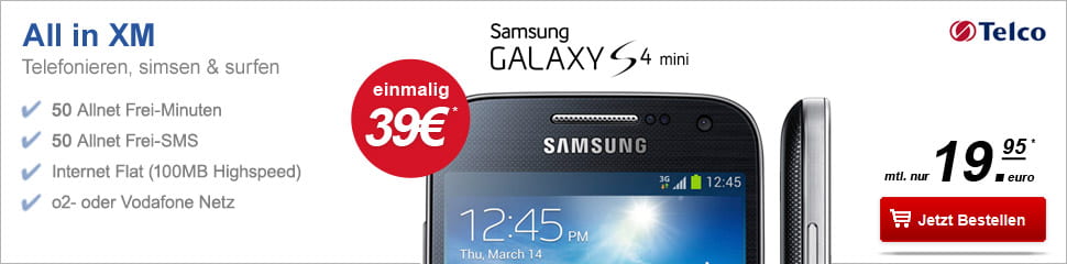 Das neue Samsung i9195 Galaxy S4 Mini erhaltet Ihr zu 39€ dazu!