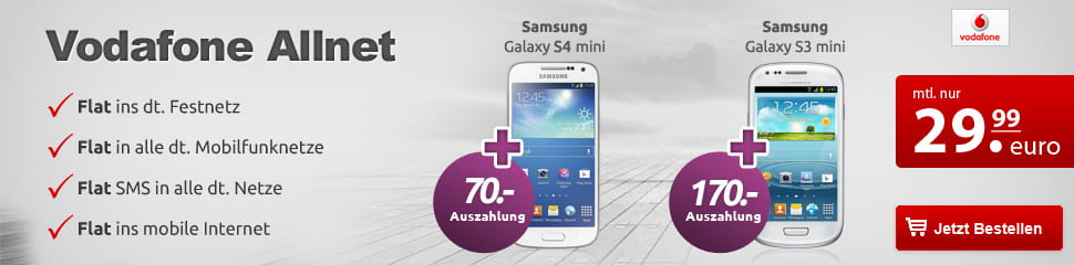 wir bieten Euch die Möglichkeit zu einer FullFlat, also wirklich alles Flat! im besten Vodafone D2 Netz zu einer monatlichen Grundgebühr von 29,99€, plus Smartphones wie das Samsung Galaxy S4 Mini oder das Samsung Galaxy S3 Mini mit einer Auszahlung bis zu -170€