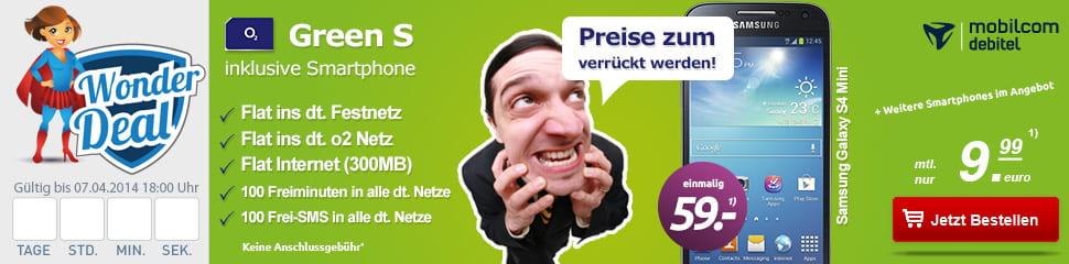 Mobilcom Debitel Green S o2 9,99€ mtl. mit Smartphones wie S4 Mini, S3 Mini etc. ab 0,-*