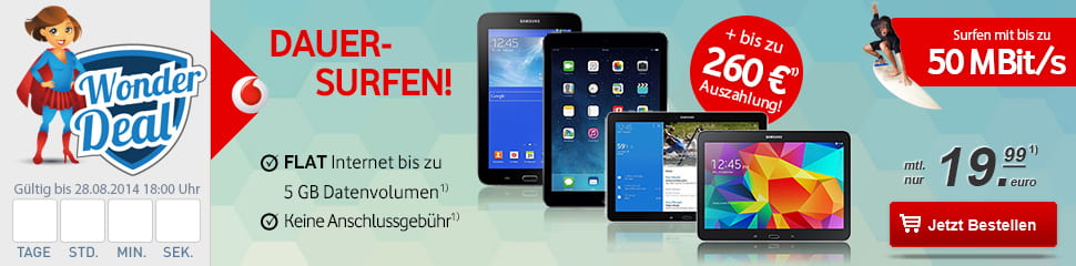 Speed Weeks bei Vodafone: Bei Abschluss im Aktionszeitraum 27.06. - 30.09.2014 surft Ihr für die gesamte Vertragslaufzeit mit bis zu 50 Mbit/s.