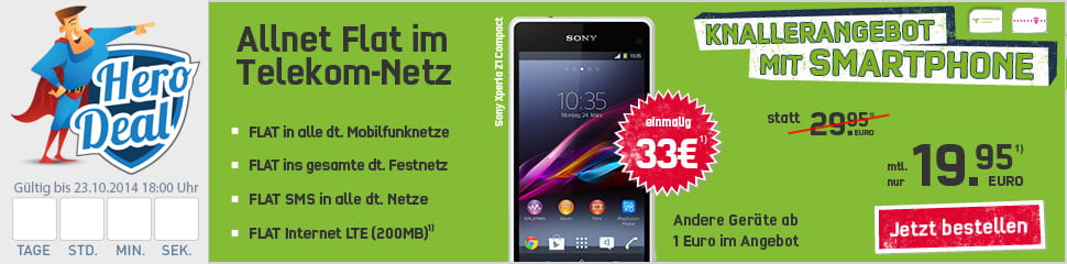 wir haben die beliebte Telekom Special Allnet Promotion Aktion für nur 19,95€ mtl. für Euch im Angebot! Besonderes Augenmerk gilt dem Knallerpreis, den wir Euch heute für das Xperia Z1 Compact (white only) machen können - nur solange der Vorrat reicht !!!!