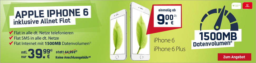 in der heutigen iPhone 6 Top Aktion gibt es das iPhone 6 & -6 Plus schon ab 9€ im VF Red 1,5GB Tarif für 39,99€ mtl.