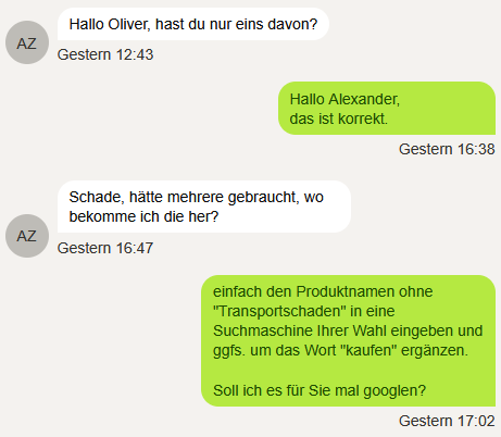 Stimmt doch nicht: Kleinanzeigen hat die Nachricht von mir irgendwie verschluckt.