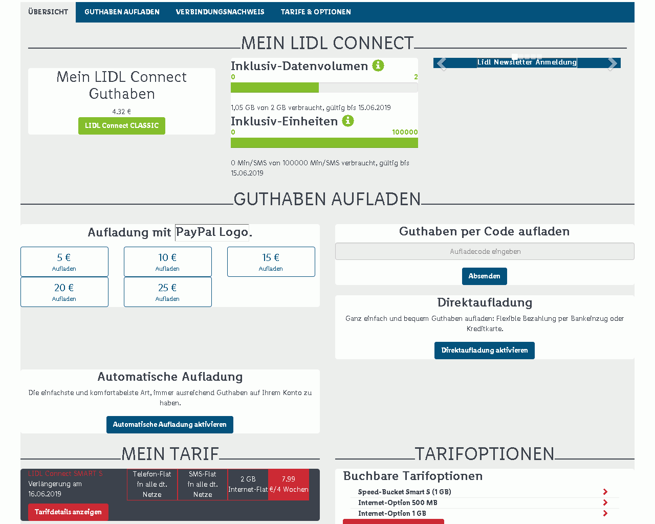 • Mitten im Optionszeitraum ( noch ~10Tage bis Ende) wird bei einer Smart S (7,99) plötzlich LIDL Classic angezeigt. 5min später trotz Anzeige LIDL Classic zusätzlich " 1,05 GB von 2 GB verbraucht, gültig bis 15.06.2019" und auch noch "0 Min/SMS von 100000 Min/SMS verbraucht, gültig bis 15.06.2019".