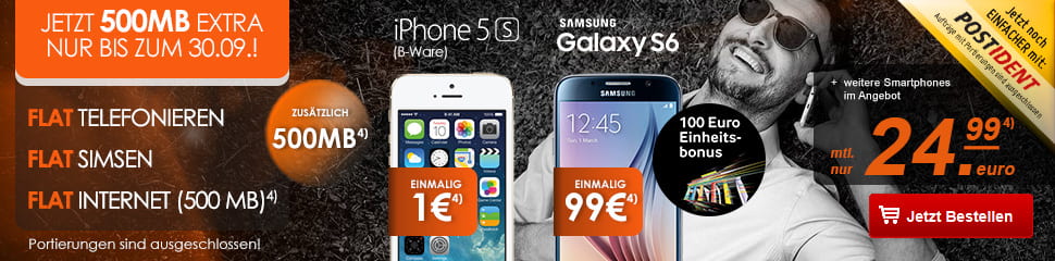 Aktionsbedingt erhaltet Ihr bei Vertragsaktivierung im Zeitraum 23.09. - 30.09.2015 ein zusätzliches Datenvolumen von 500MB gratis dazu.