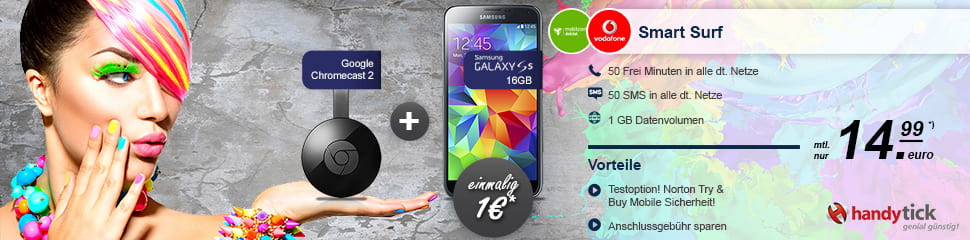 Bei Abschluss dieses Tarifes erhaltet Ihr das Samsung Galaxy S5 Mini + Google Chromecast 2 zu einmalig 1€ dazu!