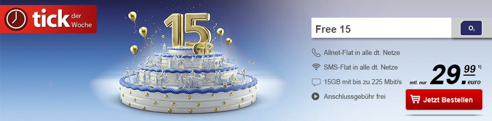 O2 feiert den 15.! Zum Jubiläum gibt es eine Allnet Flat mit satten 15GB Datenvolumen inkl LTE Speed und EU-Flat. Ab dem 15.06. ist der Tarif bzw. das Datenvolumen sogar vollständig im EU Ausland nutzbar ![]()