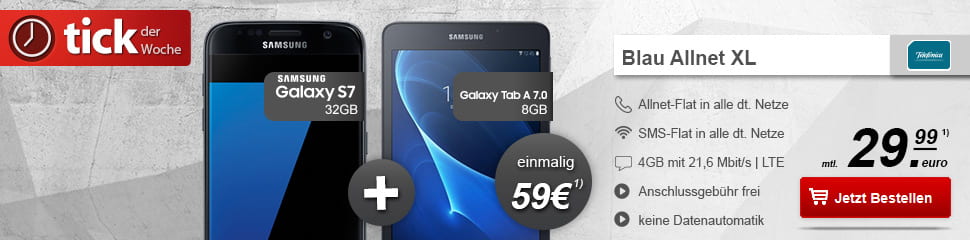 Ihr bekommt das Samsung Galaxy S7 + Galaxy Tab mit dem blau Telefonica Allnet XL Tarif zu einem unschlagbaren Preis.