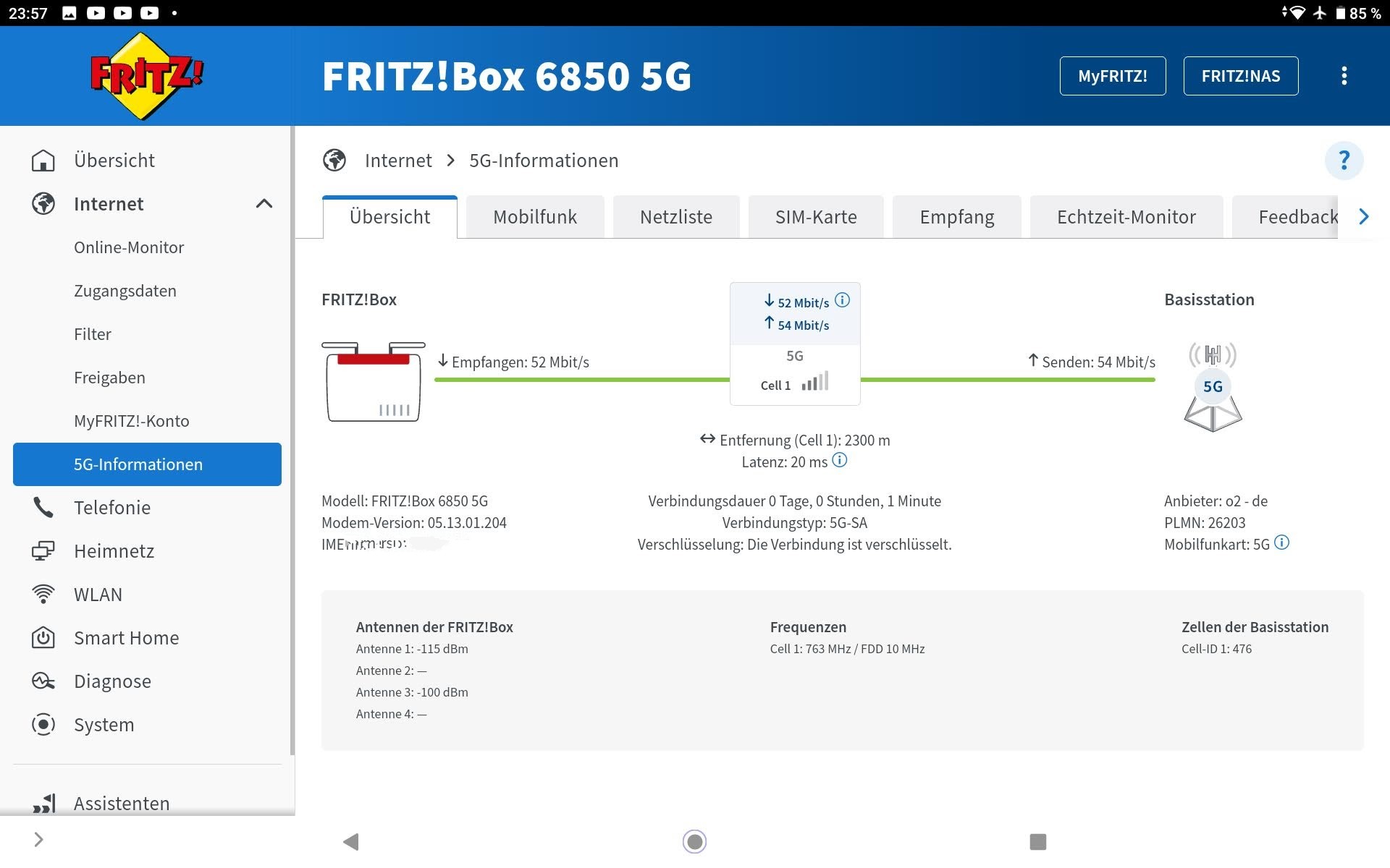 Nun dachte ich packe die gleich mal in die FritzBox 6850 5G. Die tat sich durch den Wechsel von der Datenkarte echt schwer und es dauerte ewig und mehrere Neustarts bis sie sich endlich mal verbunden hatte. Wenn ich manuell in den Frequenzen oder den Techniken versucht habe etwas auszuwählen ging dann auch nichts mehr, es wurde nicht mal manuell ein Netz gefunden. Das ist wohl etwas für ganz geduldige Menschen. Das kenne ich von der 6890 DSL/LTE oder der 6850 LTE besser. Zum Ende also alles automatisch gelassen und es funktioniert in der 700MHz SA Verbindung alles, auch die Telefonie über die SIM-Karte verbleibt bei SA 700MHz. Der Upload ist hier hinter dem Berg sogar noch besser als in der NSA 800/1800/2100MHz gleichzeitig genutzten Kombination der Datenkarte. Von den 460MBit die der Sender bei direkter Sichtverbindung liefert kommen also entweder mit NSA oder mit SA etwa 10% noch hier an aber der Upload ist deutlich stabiler was das ganze Verhalten verbessert. Es sind rund 7MBit, also auch hier 10% dessen was der Sender kann. Trotzdem ist es so das die 6890 LTE mit einer Antenne auf dem Dachboden und nur 800/1800MHz kombiniert deutlich bessere Werte in etwa meiner DSL Verbindung 50/10MBit liefert. Die 6850 5G kommt an Orten zum Einsatz wo der Mobilfunk nicht richtig funktioniert und dort arbeitet sie recht sauber. Zur 6850 5G muß man noch sagen das sie NSA 700/800MHz nicht kann und gerade dort in der B20 Kombination endlich auf N28 genutzt werden kann. Bevor jetzt noch jemand nervt das diese Werte enttäuschend sein dem will ich gleich sagen das es die anderen nicht besser können und das die gebuchten lächerlichen 150GB ganz locker am Tag verblasen werden können. Ich betreibe keine IT Upload Station und auch kein Großraumbüro. Die 50/10MBit DSL Leitung reicht für ein halbes Mehrfamilienhaus aus, alle Dienste funktionieren und auch ein paar 4K Streams gleichzeitig laufen. Die eingesetzte 6890 schafft es bei Ausfällen von DSL sogar ohne Abriss der Streams weiter alles außer der Festnetz Rufnummer nutzen zu können. Ich merke es nur weil es eine EMail zum Ausfall gibt. Durch das Teilen mit den Nachbarn habe ich außerdem weniger WLAN Störer.
