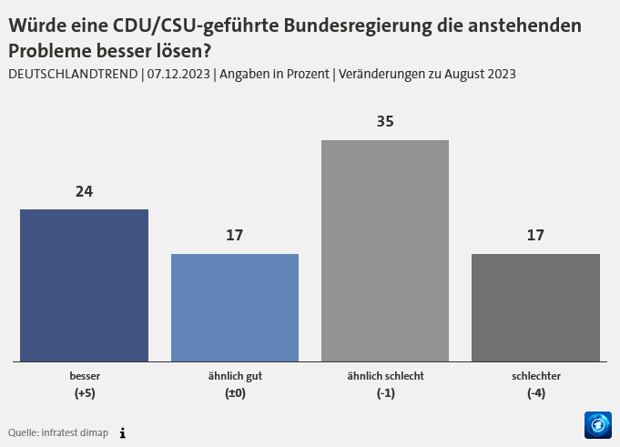 • Die Hoffnung dass es unter einer CDU/CSU-Regierung besser werden könnte glaubt, trotz der aktuell relativ guten Umfragewerte für die Unionsparteien, allerdings nur jeder vierte.