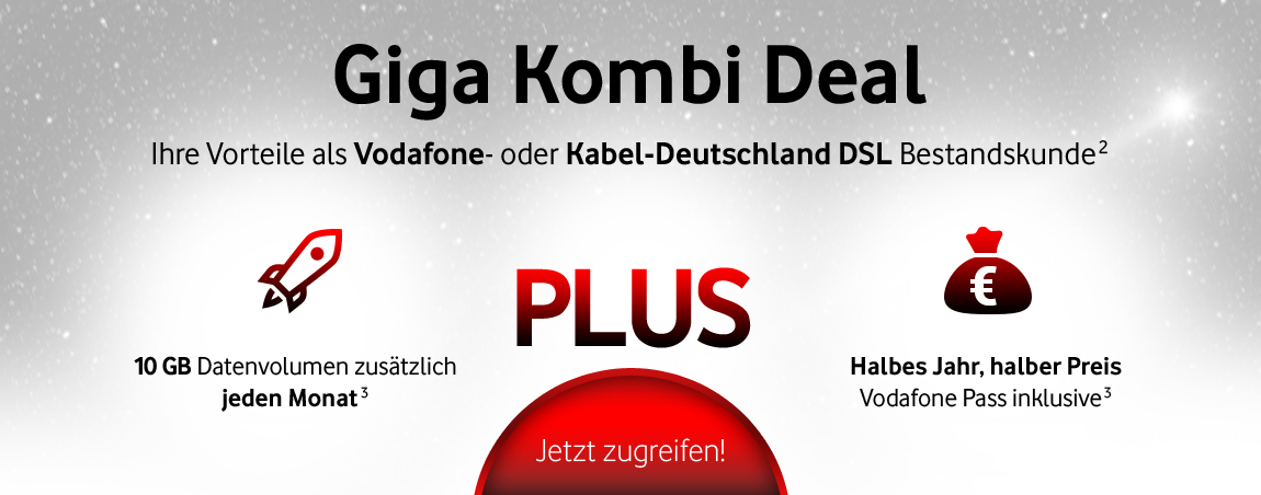 [2]* Für die GigaKombi können Sie alle Internet & Phone-Tarife nutzen, die Sie nach 2009 abgeschlossen haben. Die GigaKombi erhalten Sie mit allen Vodafone Kabel Deutschland Internet & Phone Tarifen ab einer maximalen Download Geschwindigkeit von 25 Mbit/s. Damit Sie Ihre Paketvorteile erhalten, erfolgt zwischen der Vodafone Kabel Deutschland GmbH und der Vodafone GmbH ein Abgleich Ihrer Vertragsdaten, inklusive der Bankverbindungsdaten (IBAN).
