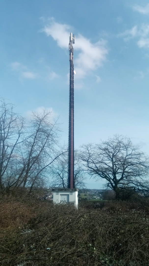 Dieser alte E-Plus-Mast, angebunden per Richtfunk an die Göttelborner Höhe, hat 66557 Illingen vom Hirschenhübel (ein Hügel mitten im Ort) aus versorgt. Er wurde von TEF abgeschaltet. Von diesem Mast kamen 2G und 3G.