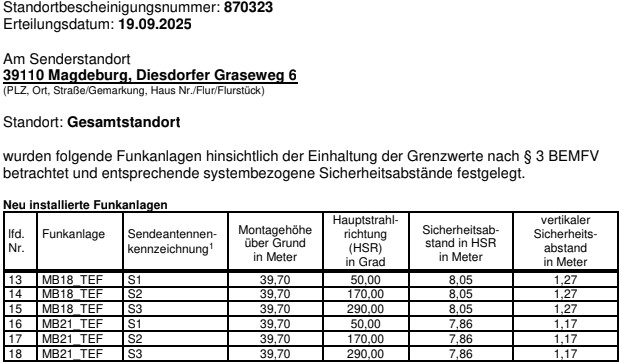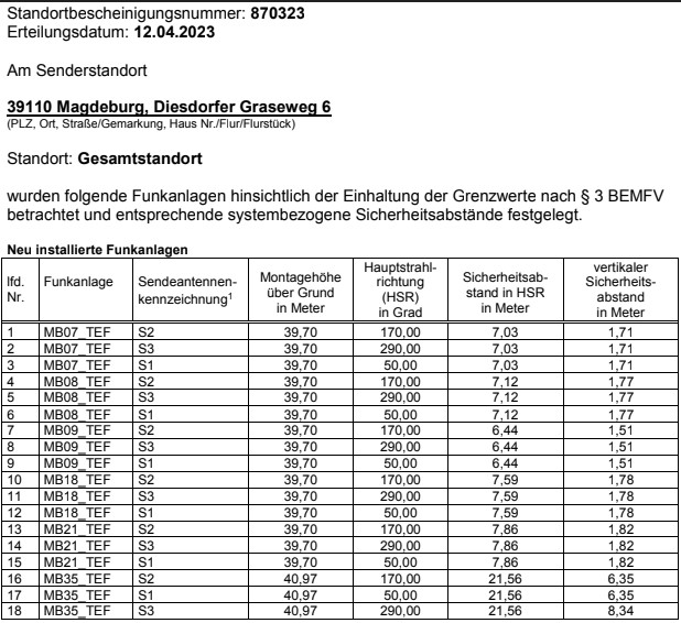 Näherer Mobilfunk Standort ist zB "Diesdorfer Graseweg 6 in 39110 Magdeburg"