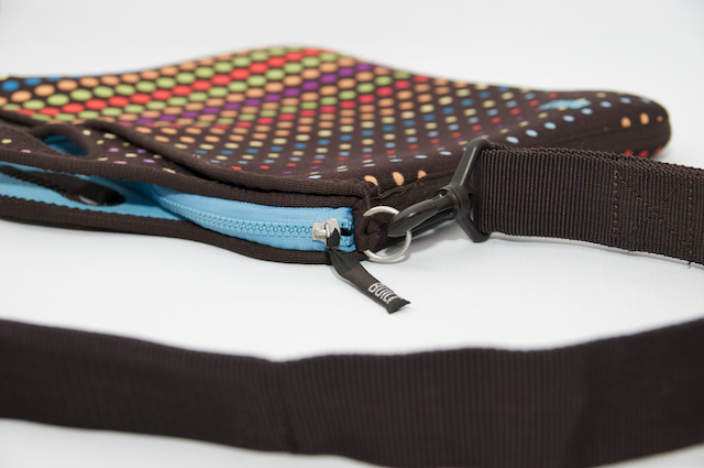 Neopren mit Reißverschluss, Griff und Umhängegurt.